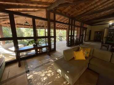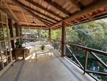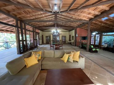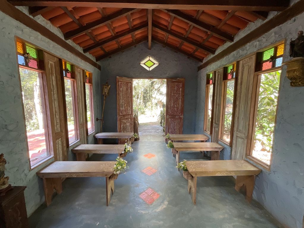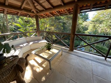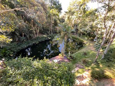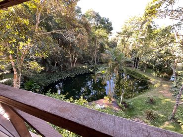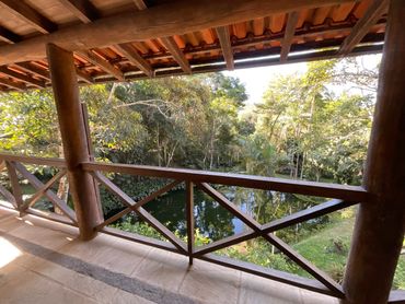 No espaço externo, distribuído pelo jardim da propriedade, contamos com quatro charmosos chalés, piscina natural, sauna seca, churrasqueira, forno e fogão a lenha, lago, capelinha, refeitório com bar e cozinha e estacionamento próprio.