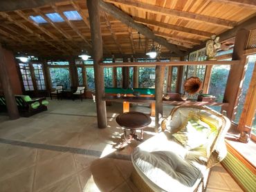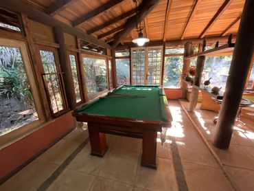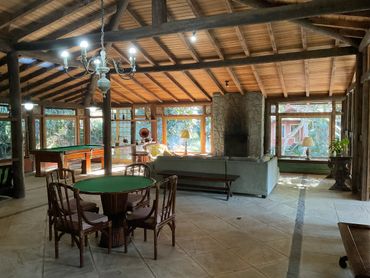 No segundo andar ficam 7 aconchegantes suítes, salão amplo com mesa de sinuca e de jogos, lareira, ambiente de TV, cozinha de apoio equipada com geladeira e fogão.