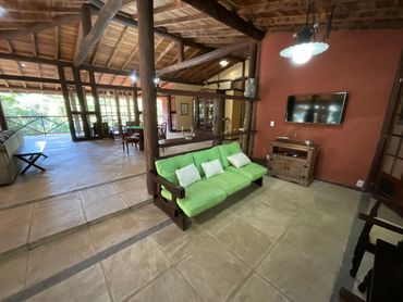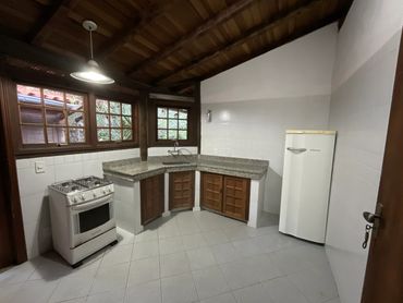 Na casa central composta de dois andares, contamos com o refeitório e cozinha equipada com todos os utensílios (pratos, talheres, copos xícaras, etc), geladeira, freezer, forno industrial e fogão.